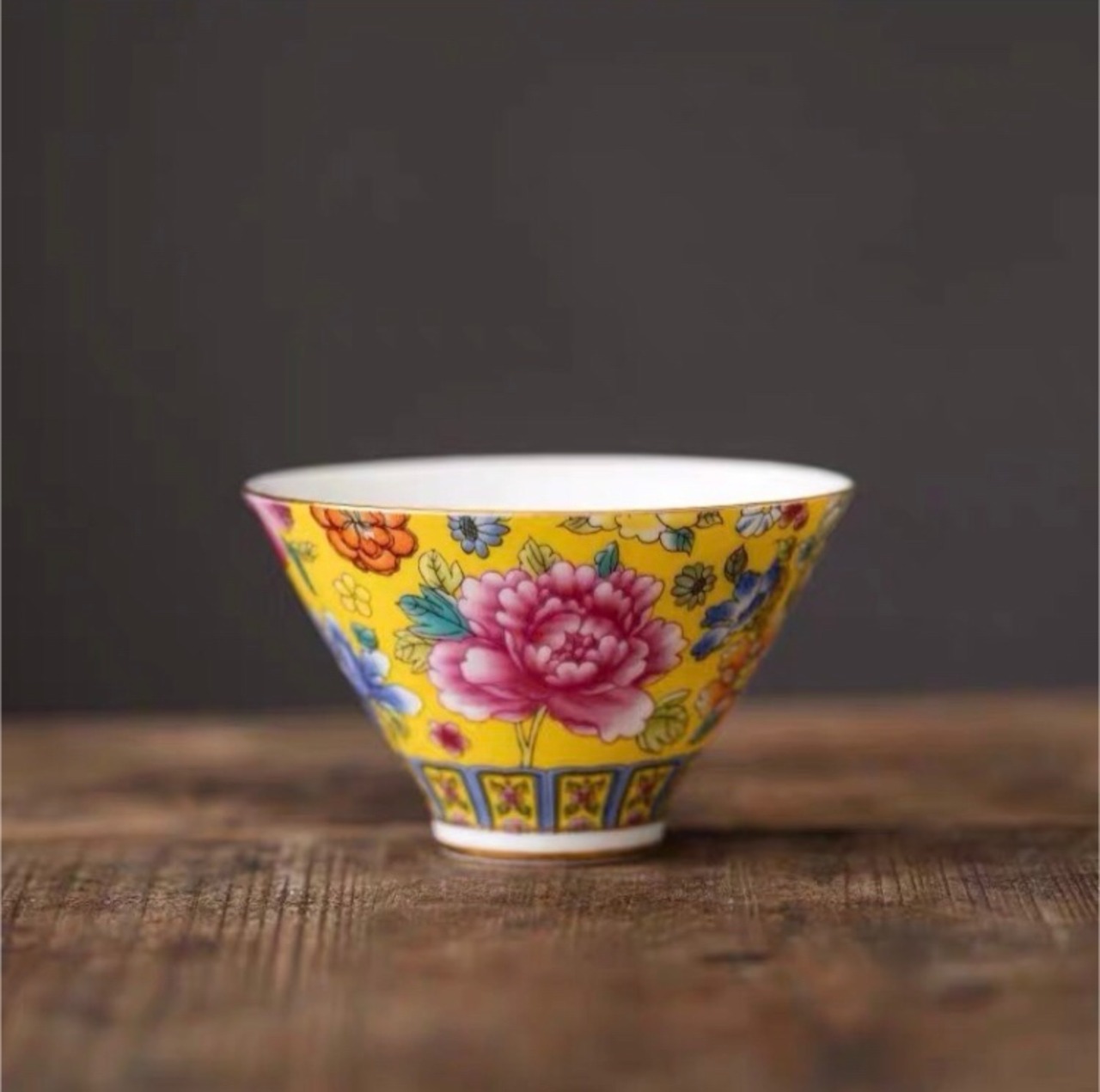 この茶杯(ちゃーべい)は粉彩(ふんさい)と呼ばれる伝統的な技法で作られた茶器です。