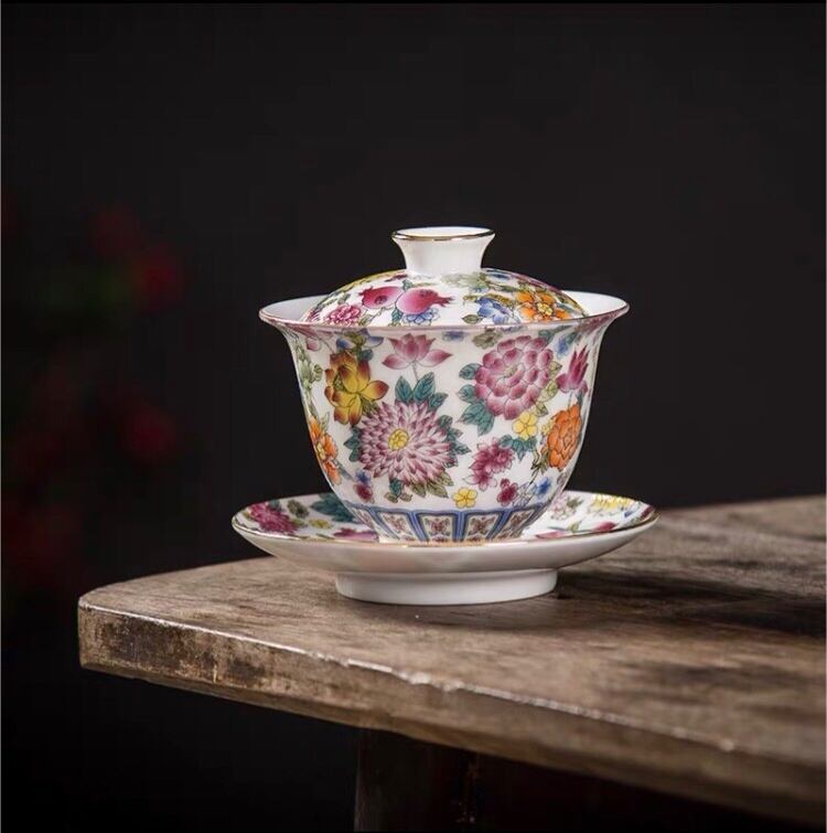 この蓋碗(がいわん)は粉彩(ふんさい)と呼ばれる伝統的な技法で作られた茶器です。