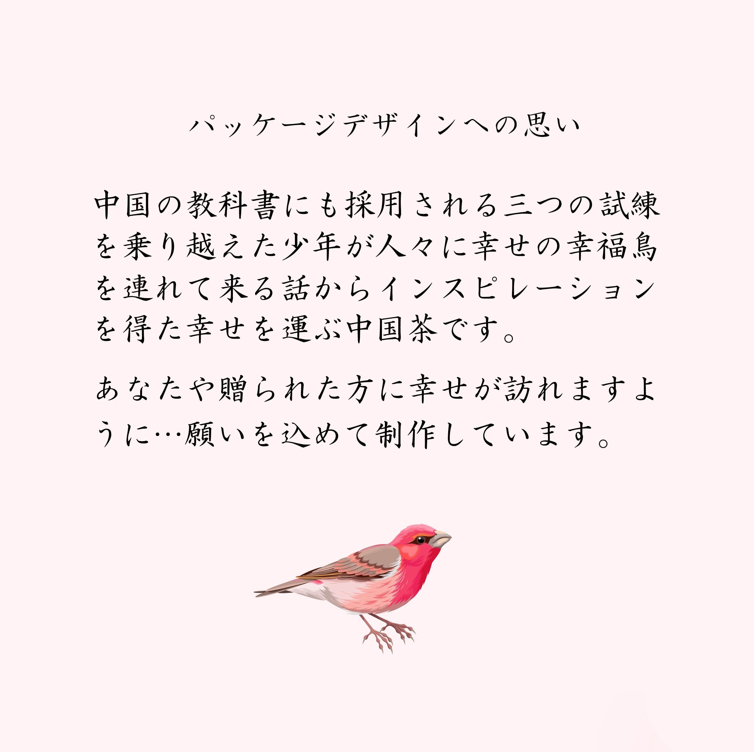 パッケージは中国の教科書にも採用される幸福鳥というストーリーをイメージしたデザインです。