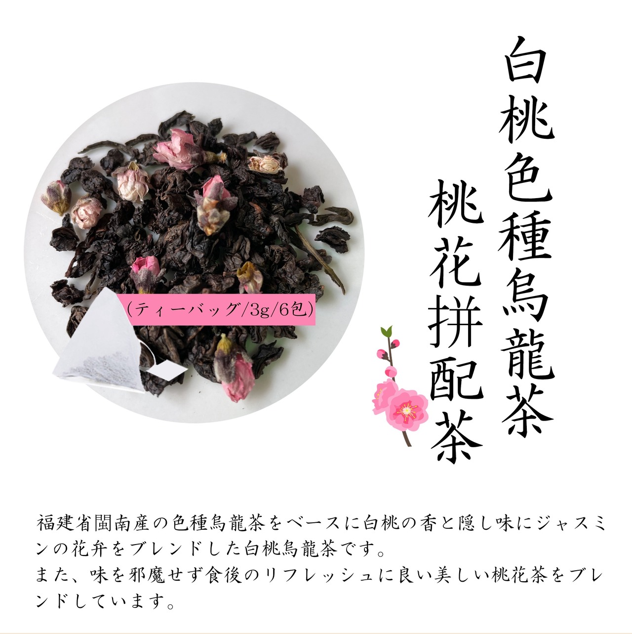 白桃烏龍茶は色種という烏龍茶。癖がなく飲みやすい烏龍茶です。白桃の甘い香り、桃花の華やかなブレンド中国茶です。