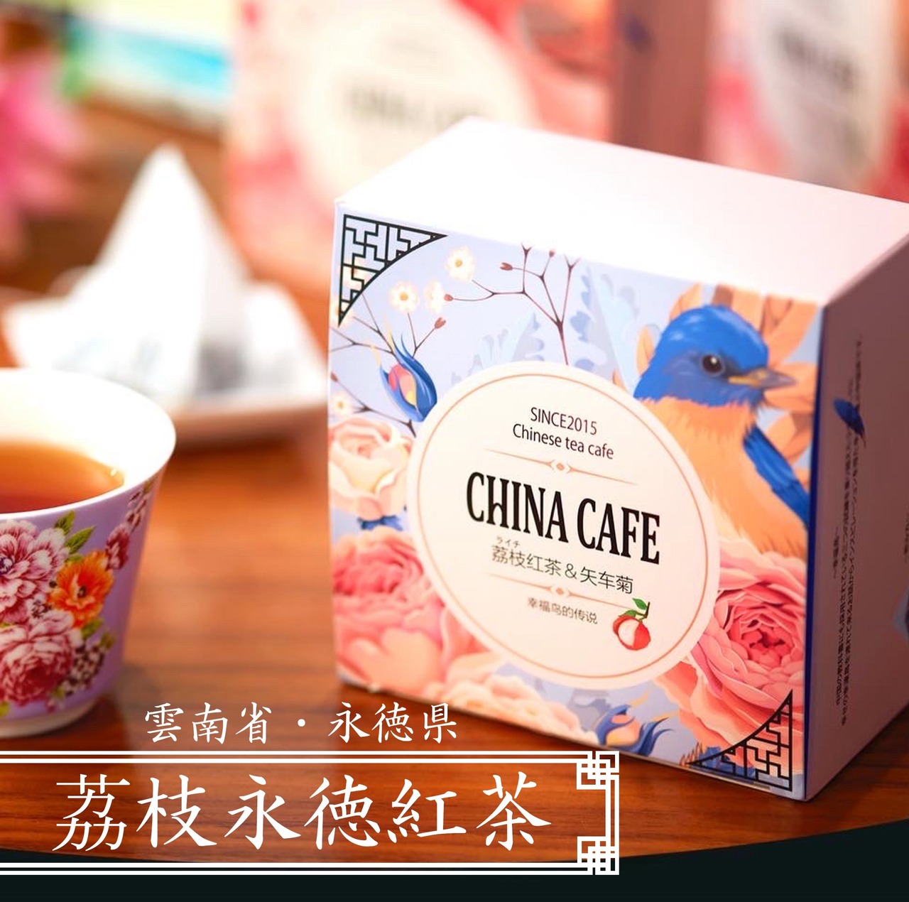 チャイナカフェ人気のライチ紅茶に矢車菊をブレンド。