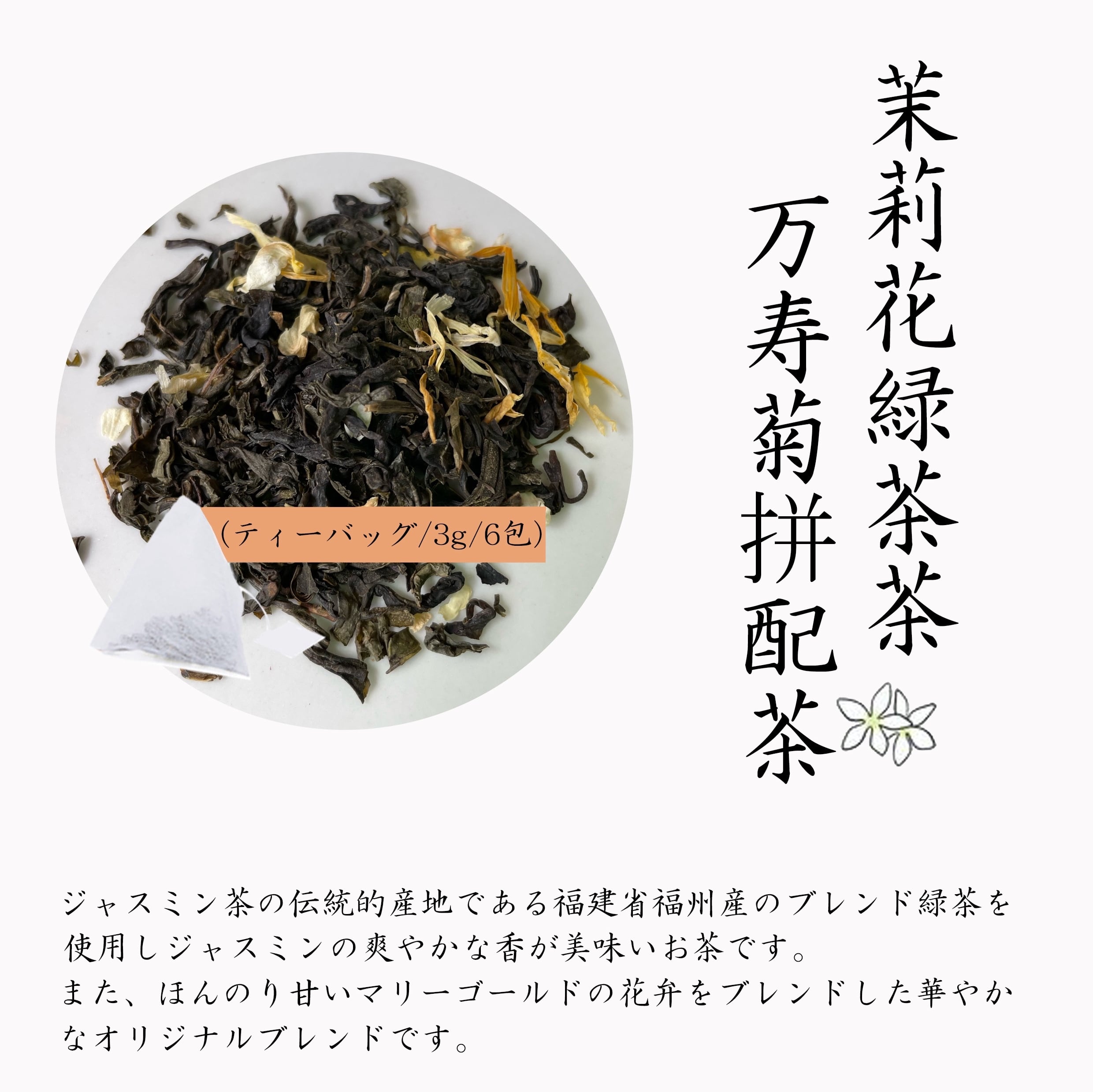 飲みやすい中国緑茶にジャスミンの花とマリーゴールドの花をブレンド。